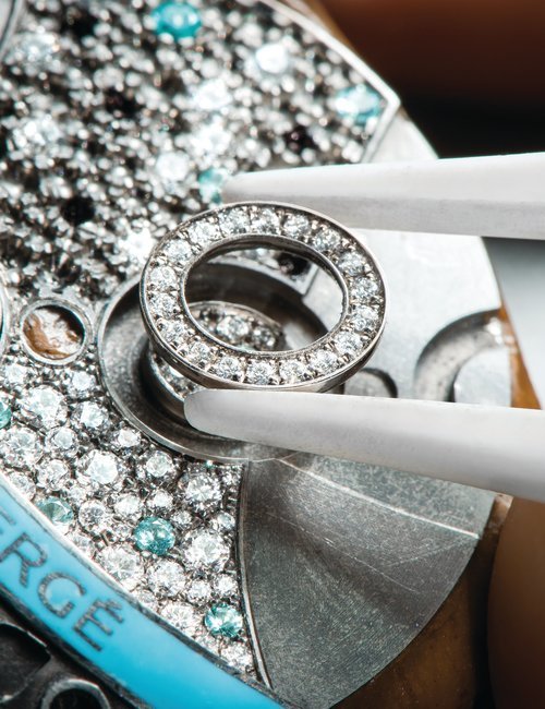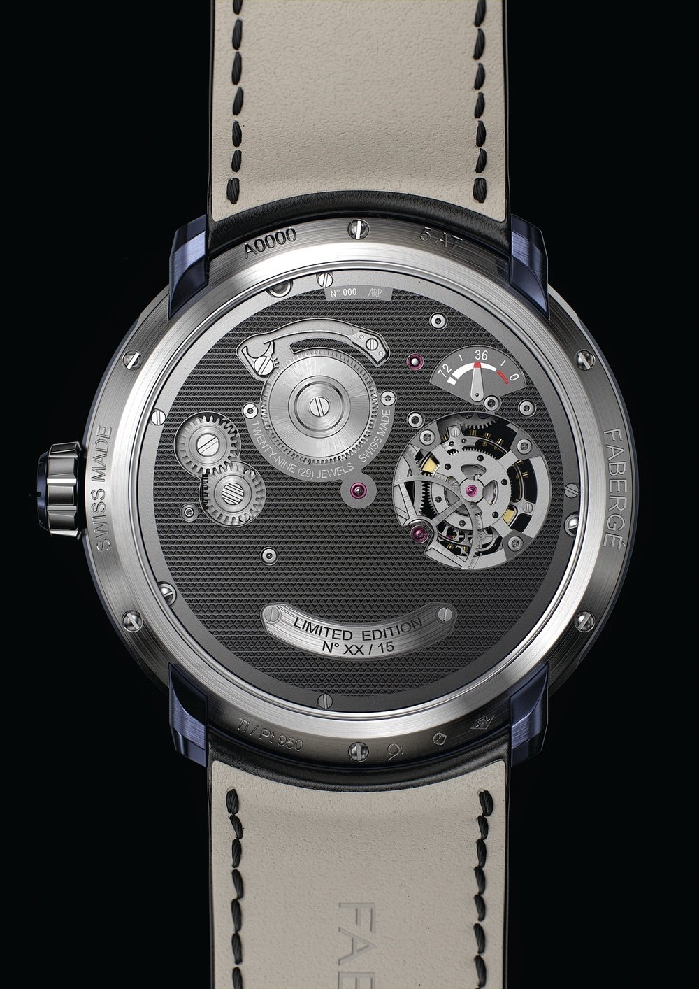 Fabergé’s first complicated watch, the Visionnaire 1 works its magic through a precious and unexpected composition reflecting the famous mysterious eggs from the Maison. This haute horlogerie model showcases the tourbillon in its most demanding version: the flying tourbillon. As if suspended in its carriage at 9 o’clock, this fascinating horological complication performs its seductive rotations in full view. The movement gear wheels may also be fleetingly glimpsed between the trapeze shapes forming a 3D rosette motif in the centre of the watch, while the back also reveals the most essential elements of this refined mechanism. The flying tourbillon appears in a hollow at 3 o’clock, topped by a discreet power-reserve display. The barrel ratchet-wheel draws the gaze with its pawl and spring hugging its circumference. 15-piece limited series.