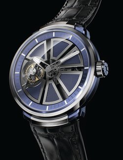 Movement adorned with guilloché, chamfered and satin-finish blue trapezes, shotpeened, chamfered and hand-polished NAC-treated nickel silver bridges and mainplate, 72-hour power reserve