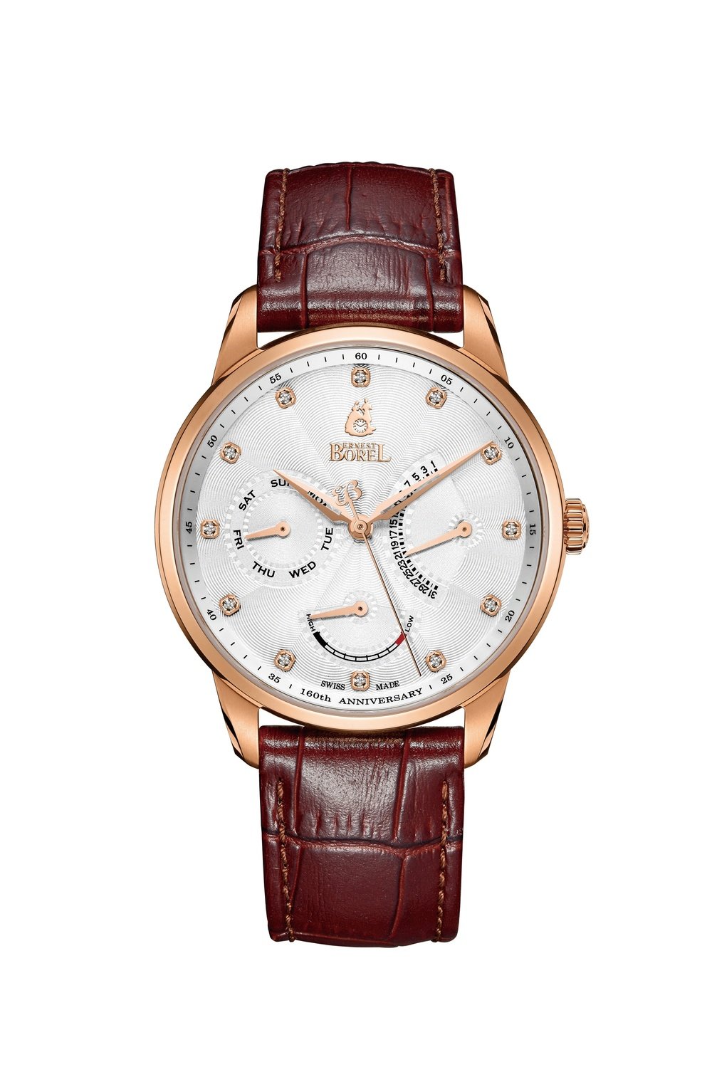 For its 160th anniversary, Ernest Borel unveils a collection of ten watches that pay tribute to its founder, Jules Borel, and his watchmaking legacy. Among the models in this anniversary line, Ernest Borel presents an exclusive timepiece that lends an air of classic elegance to the much-appreciated indications of day, date and power reserve. A highly legible silvered dial, the perfect proportions of the pink gold PVD steel case, and the superlative reliability of the mechanical automatic movement together convey the quintessential expertise which the brand has deployed since 1856. A contemporary expression of Ernest Borel’s rich history, this refined timepiece is distinguished by its enduring appeal. This is a lesson in style, proposed as a limited edition of 888 pieces for men who appreciate classic watchmaking and mechanical precision.
