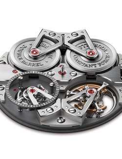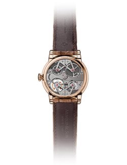 Visible movement with twin barrel at 12 o'clock, tourbillon between 4 and 5 o'clock, true beat seconds between 7 and 8 o'clock.
