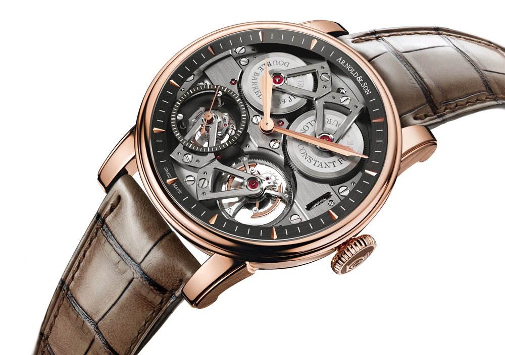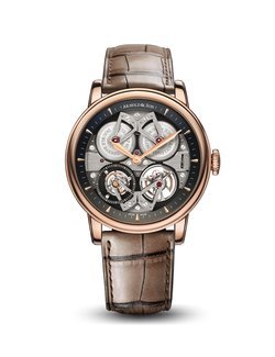 British watchmaker John Arnold (1736-1793) ranked among the most eminent specialists in marine chronometry. Established in La Chaux-de-Fonds, Arnold & Son continues to find inspiration in its founder’s work. The Constant Force Tourbillon is a technically superlative wristwatch that reflects the eighteenth-century watchmaker’s ingenuity. The manufacture movement is equipped with a constant force mechanism and true beat seconds. The former has two series-mounted barrels at 12 o’clock that ensure an optimal and regular flow of power to the tourbillon. The latter, which is clearly visible between 7 and 8 o’clock, stores energy from the balance via a spring, which it releases at each elapsed second only. The seconds hand therefore advances incrementally, allowing time to be read with greater ease and precision. 28-piece limited series.