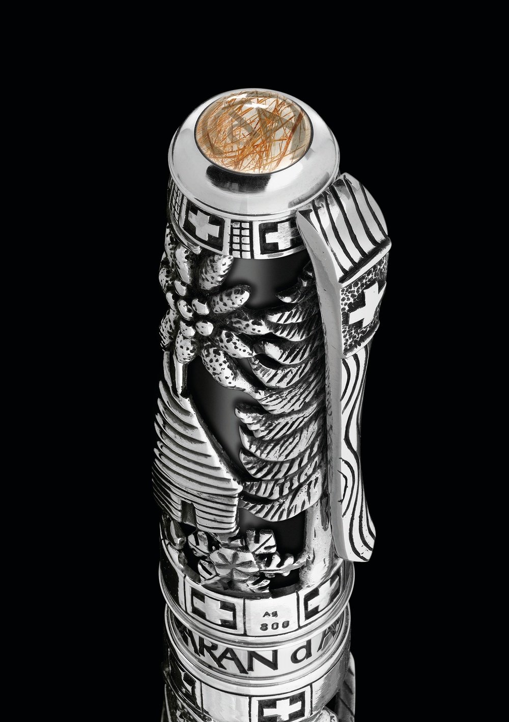 Part of the grand tradition of Swiss manufacturing excellence, Caran d’Ache develops and makes in Geneva products that meet the criteria imposed by the Swiss-made label. For its 100th anniversary, the brand has imagined a tribute to its homeland. Created in collaboration with a Swiss craftsman-jeweller, this limited edition captures the traditions of the Alpine nation in fourteen figurative representations, each characteristic of Switzerland’s cultural identity and heritage. Sculpted in solid silver, these scenes stand out against the matt black body of the pens: meadows, mountain tops, edelweiss, Alpine horns and of course, the legendary Swiss chalets. These writing instruments even contain a superb mountain jewel, admired since ancient times for its ornamental value: a rutile quartz cabochon that is set in the tip of the cap. This limited series comprises 100 fountain pens and 100 roller pens, each numbered.