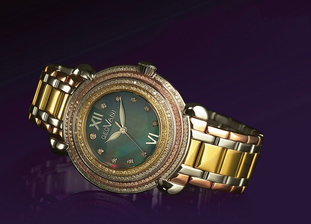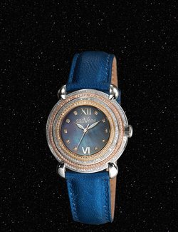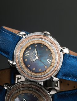 Mingling gemsetting, precious materials and refined design, Geovani has been cultivating authentic expertise in the field of jewellery watches since 2005. Like all models composing the brand’s collection, Catherine is an anthem to diamonds and exalts the beauty of this precious stone through a dainty gemsetting. The bezel adorned with four concentric circles displays a pleasing contrast between the white colour of the steel and the warm shades of the pink gold or yellow gold PVD plating. Thus framed by a sparkling exterior, the bluish mother-of-pearl dial gives an exquisitely shimmering glow to the passing of time. This contemporary and classic composition clothes the wrist with a singular blend of radiance and softness that delicately enhances its femininity. Around the clock, for daily wear or shining evenings, in every moment of life, Catherine clings like a second skin while exuding unmistakable elegance and style.