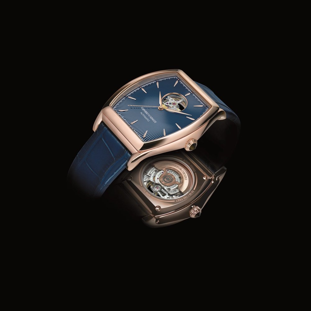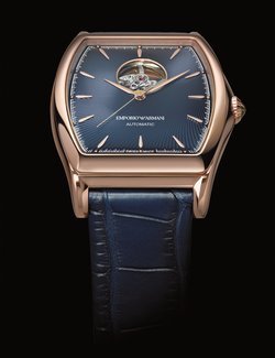 The Emporio Armani Swiss Made collection welcomes a new reference inspired by Art Deco elegance. The Classic line now includes a tonneau-shaped case with a flowing design. On this rectangle with subtly softened sides, the roundness of its flanks is accentuated on all levels. The crown is surrounded by a gentle swell, a curve shared with all Emporio Armani Classic watches. Its caseback is also rounded and this flowing design extends into pleasantly ergonomic lugs. Beneath the sapphire crystal, the dial with its sunburst motif is a bright blue that stands out against the rose gold glow of the case. Emporio Armani Swiss Made also introduces a new STP 5-15 calibre, an automatic movement which has been reconfigured to feature a window into the balance-wheel and its openworked bridge.The gentle lines are thus matched by the transparency of an elegant and complex watch.