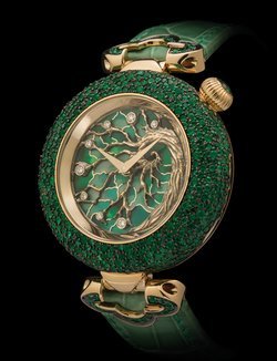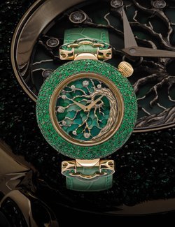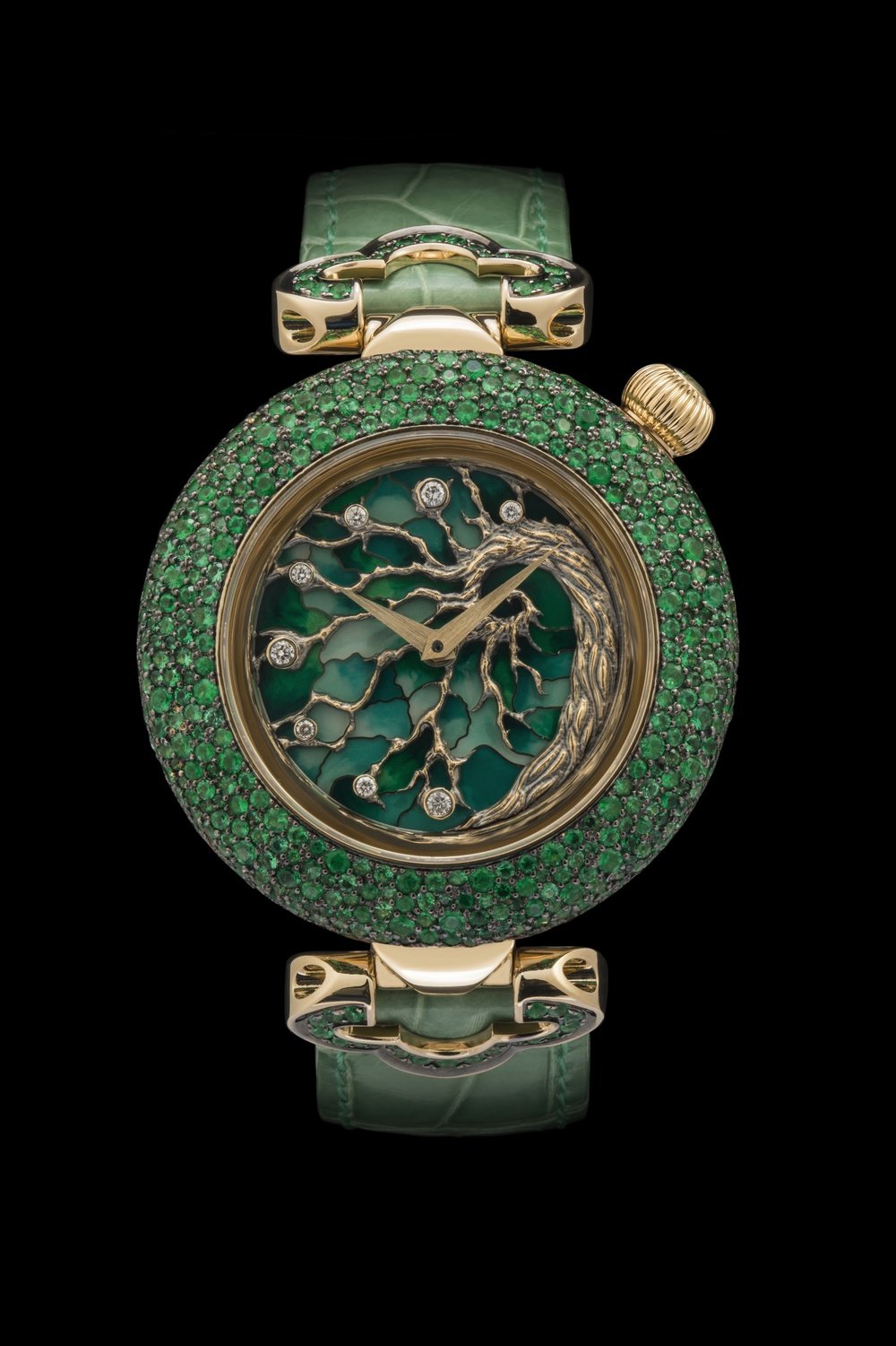 The horological creations by Kerbedanz are infused with powerful symbolism. These messages are conveyed through an artistic interpretation of the cases and dials on Kerbedanz watches. The Tree of Life is a jewellery anthem to immortality, symbolised by the tree after which it is named. With its deep roots and spreading branches, it unites heaven and earth, spirituality and eternity. Framed by a case entirely set with green emeralds that are the colour of life itself, a hand-sculpted gold tree adorns the green enamelled dial. This scene is suffused with the light of sparkling diamonds. The dainty chatons embedded into the gold and enamel are the fruits of the tree, each a token of immortality. Kerbedanz has also decorated the original Technotime base calibre with equally meticulous care. This 41-piece limited series speaks of mystery, life and hope, making the Tree of Life a complete and rare work of art.