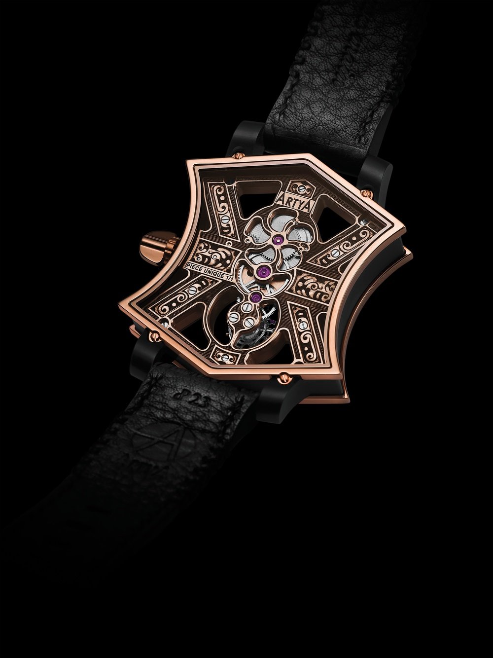 The new Cumbere Tourbillon is undoubtedly the most avant-garde watch in the entire Swiss watch business. Well-known industry maverick Yvan Arpa, founder of the independent ArtyA brand, unleashes a one-of-a-kind model with a powerful character. Delicately hand-carved in the exclusive ArtyOr alloy, this Cumbere Tourbillon is shaped like a guitar. The baguette-type movement equipped with a flying tourbillon appears at the centre of an entirely skeleton-worked X-shaped structure. This light-flooded watch thus reveals all the subtle details of its Haute Horlogerie finishes, notably including hand bevelling and artisan-style ageing of the engravings. This one-off piece is the ultimate embodiment of what happens when art meets luxury.