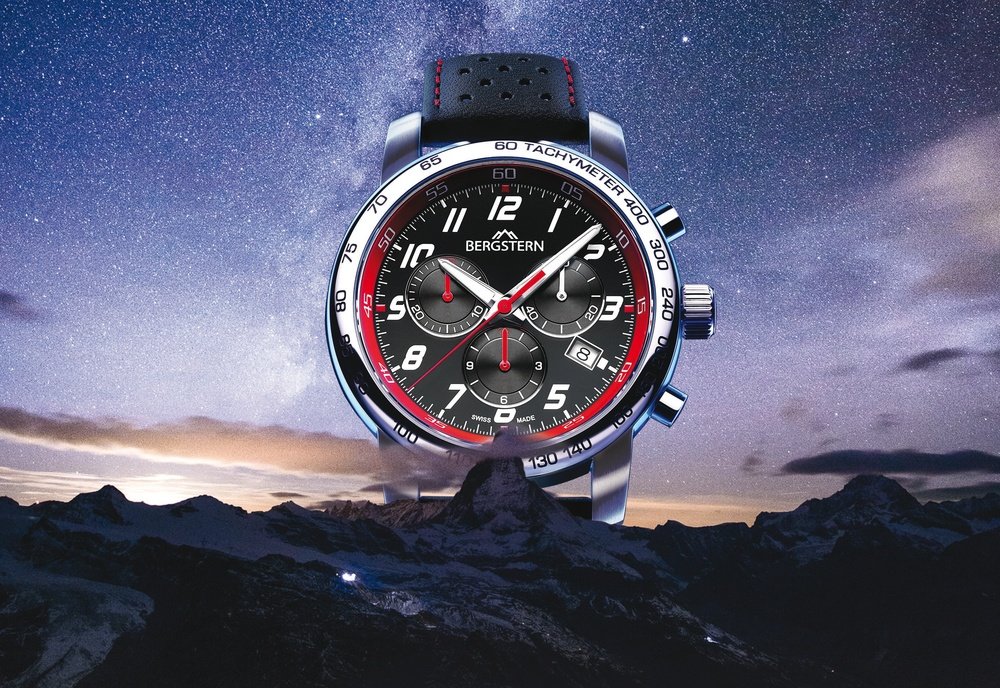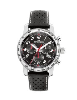 Bergstern is designed for dynamic, self-assured men. Their ambition is visible in their watch, which expresses their life choices. The Bergstern chronographs in the Active line are well up to the task of handling daily challenges. These reliable and sturdy instruments embody a vision of performance reflected in the brand’s aesthetic choices. A perforated strap with red seams tells a motor-racing story. The Arabic numerals feature a modern font that makes them appear to lean into the curves due to the effects of speed. The red chronograph hands and inner bezel ring signal a practical determination to ensure legibility and smooth action. All functions including the tachymeter scale on the bezel are driven by a Swiss chronograph movement. The Active chronograph by Bergstern comes in a generously sized 42 mm stainless steel case that is water-resistant to 100 metres.