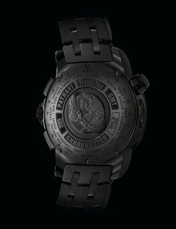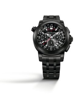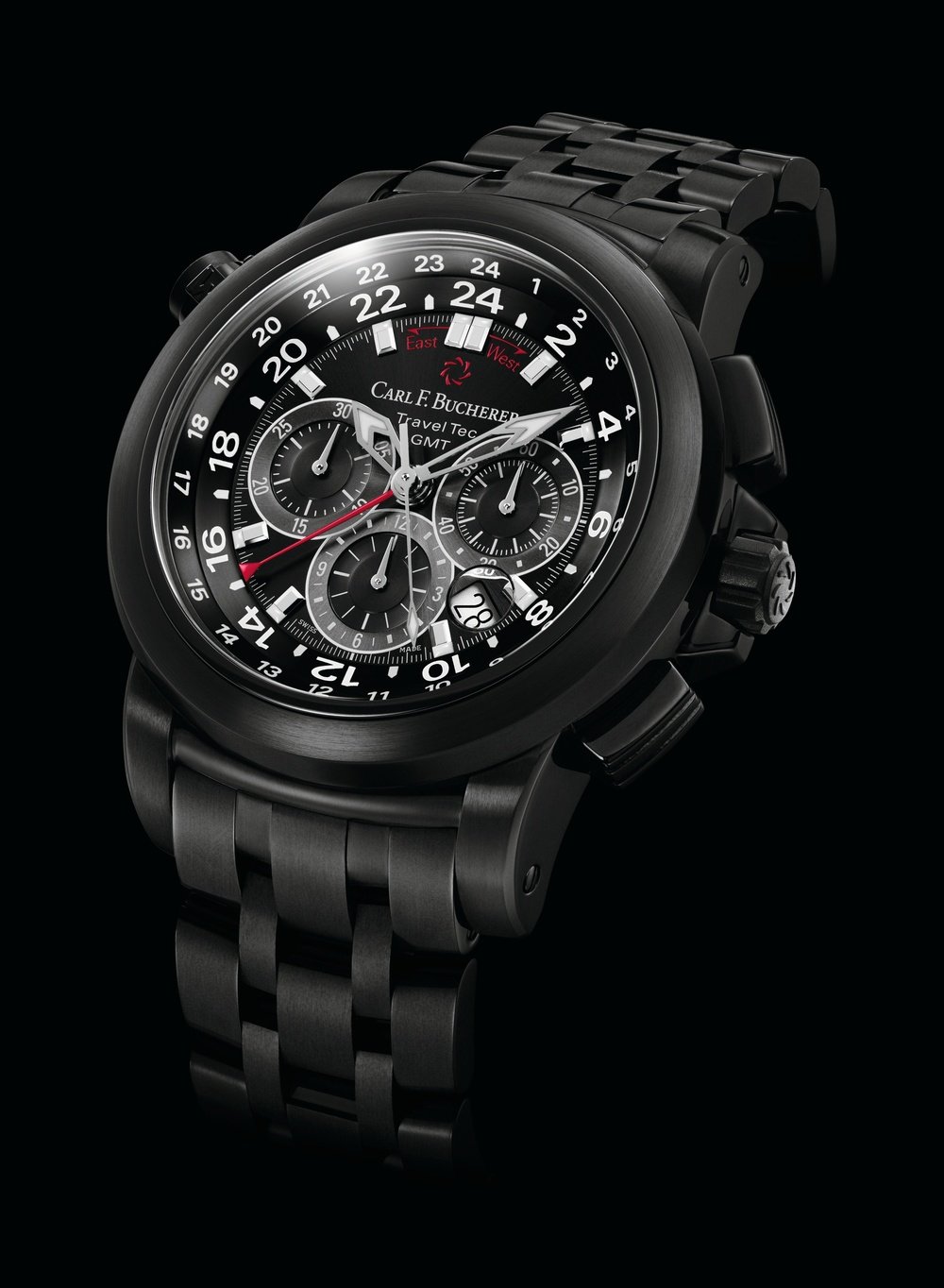 Carl F. Bucherer delivers a timepiece that is finished to the highest standard. First the exterior: the stainless steel case benefits from a DLC (diamond-like carbon) treatment that confers a compelling, deep matt black aspect. This crystalline carbon coating, applied in layers, has a structure similar to that of diamond. This guarantees a continued intensity of colour over time, as well as exceptional scratch-resistance and resistance to shocks. As for the movement, in addition to a chronograph function, the TravelTec Black displays a triple time zone. To achieve this, the watchmakers have literally merged the COSC-certified movement with the case: a patented pusher at 10 o’clock pivots an inner bezel, which is graduated for the third time zone over 24 hours. The other two time zones are displayed on the dial.