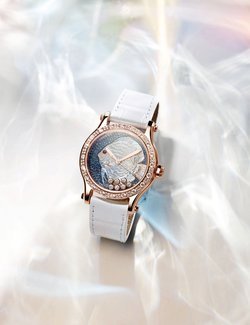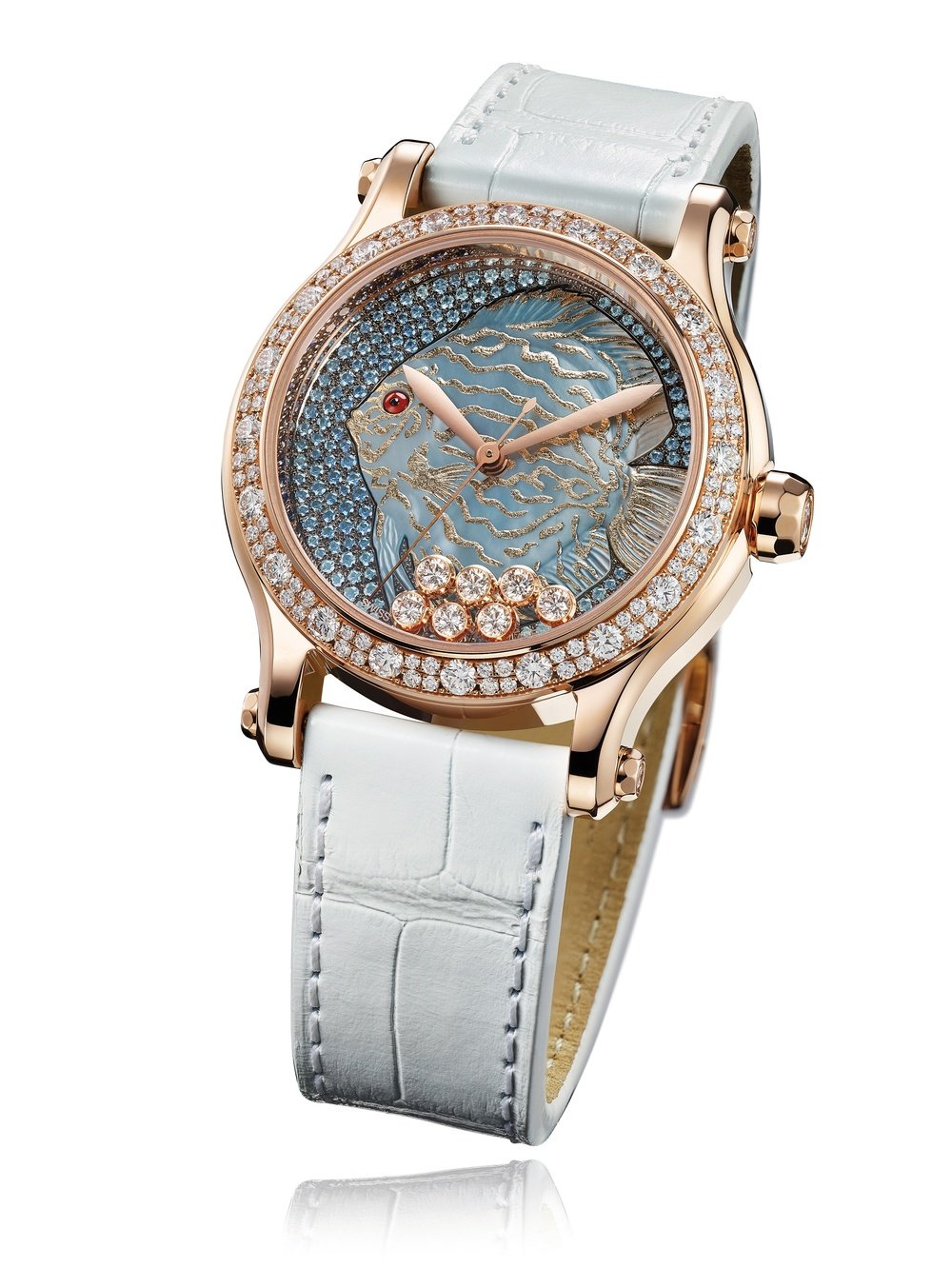 It was in 1993 that Caroline Scheufele created one of the Chopard icons, the Happy Sport watch. Ever since, recurrently reinterpreted over the years in occasionally humorous and consistently elegant ways, it has appeared under countless highly evocative identities. Today, the beautiful Happy Fish collection is enriched with a splendid model. This watch vividly evoking the underwater world showcases artistic crafts applied to creating a poetically romantic effect. The textured mother-of-pearl and gold leaf fish swims gently amid an ocean of blue sapphires, appearing to make its way around seven moving diamonds. Amid the darkness of the depths, a gentle turquoise light suffuses this splendid luminescent décor. The exquisite jewellery craftsmanship continues on the bezel, set with diamonds of three different alternating sizes for a softer effect. This 25-piece limited edition is exclusively available in Chopard boutiques and corners. Model presented at Baselworld 2015.
