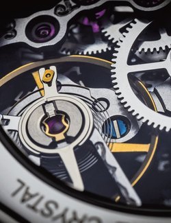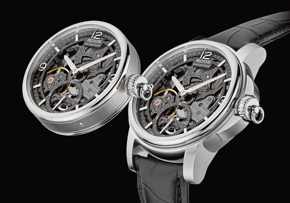 Transparency and versatility guided Epos in the creation of the 3429 Skeleton. This wristwatch transforms effortlessly into a pocket watch, simply by releasing the case attachment system in one of the brancards (vertical sides). A foldaway stand means it can also be admired as a desk clock. The Unitas 6498 calibre is thus reunited with its original function, which is to equip pocket watches. Epos has embellished this movement with engraving, while skeletonisation creates magnificent transparency. Such meticulous finishing is highlighted by the simplest of dials, comprising a minute track, small seconds and hour-markers, and proposed in a choice of colours that includes ruthenium grey and bright green: further proof of the versatile nature of this transformable timepiece, produced as a 2,015-piece limited series.