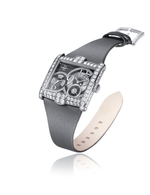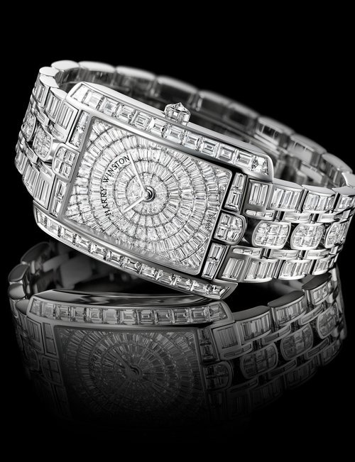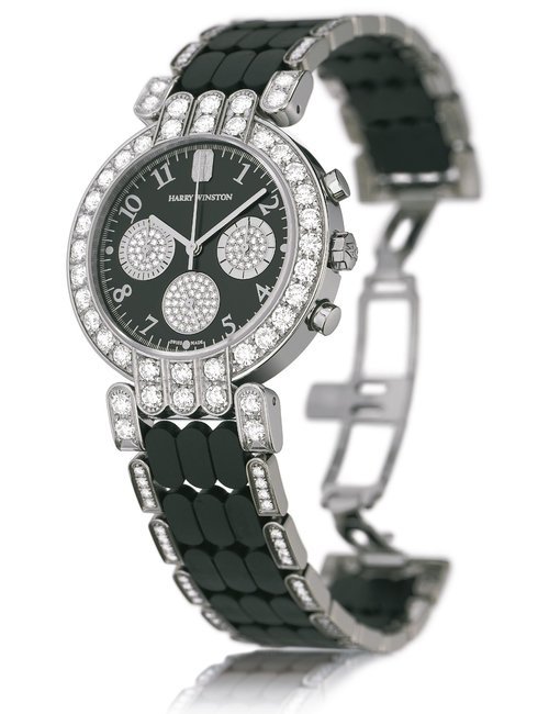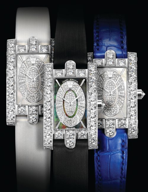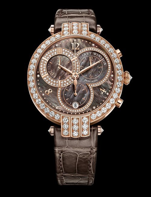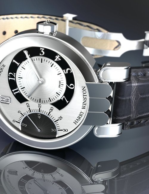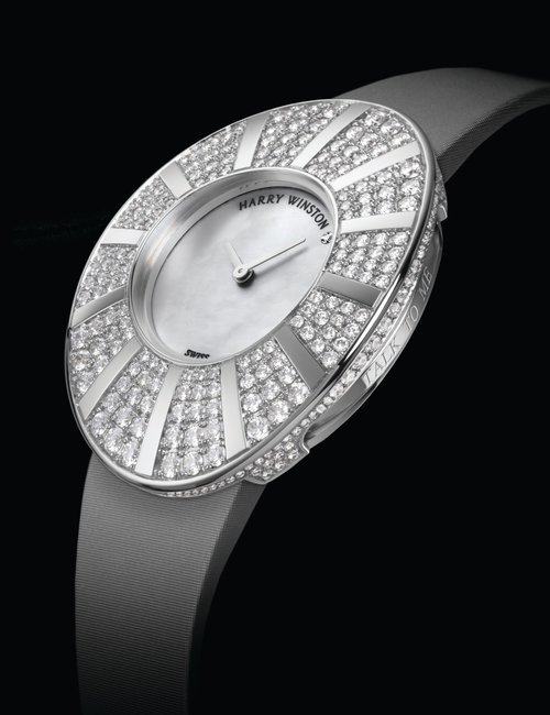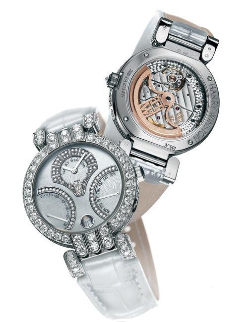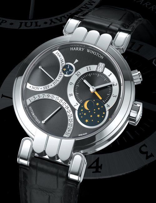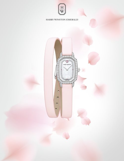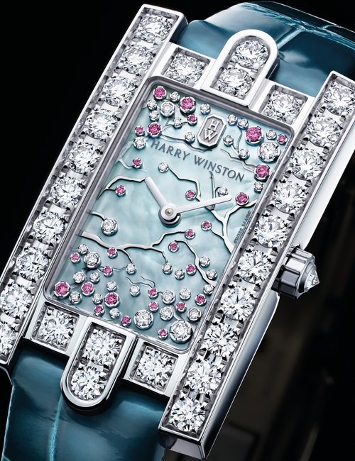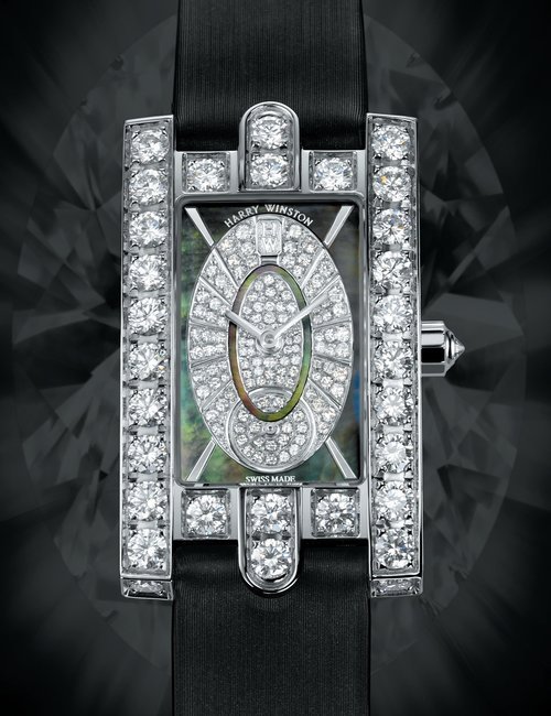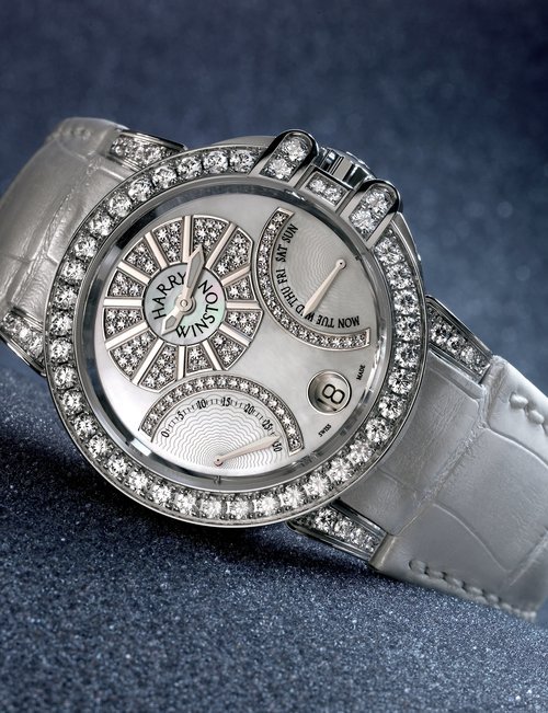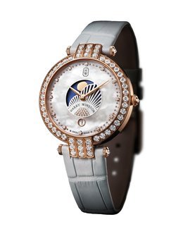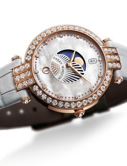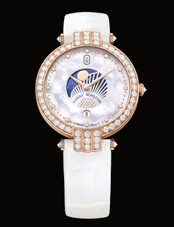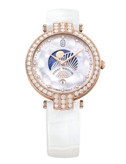 Harry Winston presents the Premier Moon Phase 36 mm, a poetic and surprising timepiece. Whereas in the majority of moon-phase mechanisms, the moon disappears completely before beginning a new cycle, here the golden moon takes cover behind a delicate mother-of-pearl lattice, hidden but not completely out of sight. This supremely elegant design echoes the light and shade cast between Earth and the sun in a completely unprecedented manner. The deep blue mother-of-pearl sky forms an eloquent contrast with the immaculate white mother-of-pearl dial, a composition that irresistibly draws the eye to the centre of the watch. Bringing this magical tableau to life, 18 brilliant-cut diamonds are set just above the date at 6 o’clock, like a sunbeam reflecting the halo of precious stones that adorn the dial, bezel, arches and buckle. Together they form a dazzling ensemble of 104 diamonds for 2.58 carats.