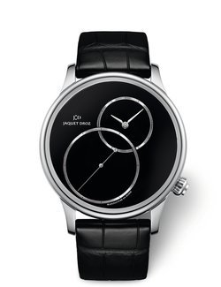 Imagined in the eighteenth century by Pierre Jaquet-Droz, the Grande Seconde has never ceased to reinvent itself, balancing a sense of history with modern elegance. For this supremely sober interpretation, the craftsmen at Jaquet Droz have revisited the “figure 8” aesthetic by offsetting the seconds and, at the same time, enveloping the two interlocking rings in an air of mystery. Presented for the first time in a 43-mm steel case, the Grande Seconde Off-Centered amplifies the intensity of black with an onyx dial that has been painstakingly cut and polished, in the grand tradition of mineral dials by Jaquet Droz. Like darts of light across a liquid surface, it creates a voluptuous play of brilliance. Equally captivating is the extraordinary sense of aesthetic in this mechanical timepiece, whose point of equilibrium extends onto the case with the discreet winding crown, also off-centred.