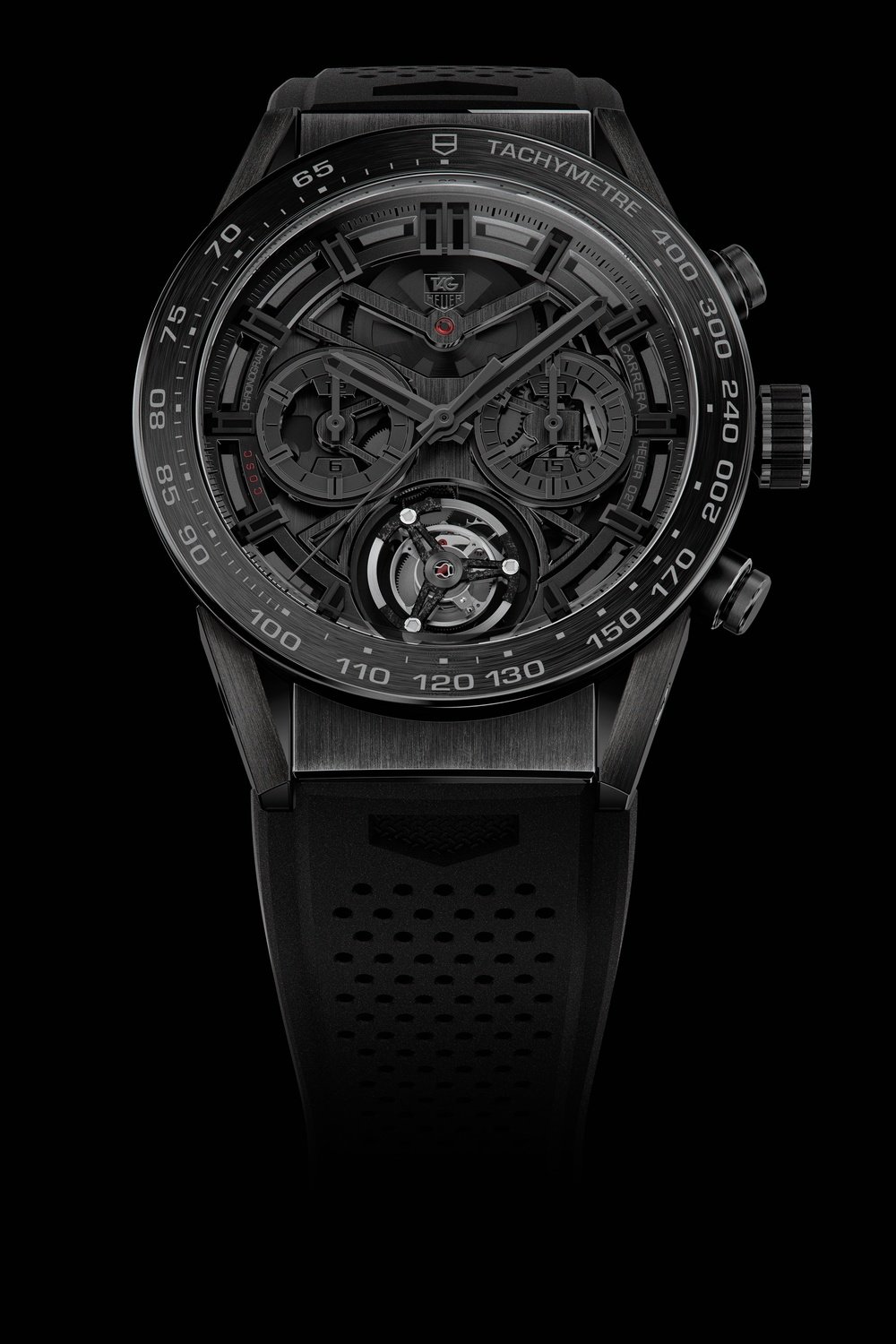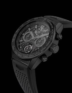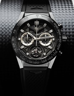 Less than a year after the launch of the Carrera Heuer 01 in-house chronograph, the new generation of Carrera incorporates a chrono plus a flying tourbillon. The Carrera Heuer 02-T is entirely designed, developed and produced at the Manufacture TAG Heuer. For the Black Phantom model, the new Carrera case, made from 12 separate modular parts, is fashioned from black titanium. It houses the very latest TAG Heuer calibre, the Heuer-02T. This chronograph movement is directly inspired by the CH-80 and is COSC-certified. Here, it combines with a tourbillon regulator that stands out for its black and grey design, its lightness thanks to the use of titanium and carbon, and its flying construction. This new timepiece naturally shares the skeletonised, sleek, contemporary design of the new generation of Carrera watches, with its skeleton bridges, openworked hour circle and geometric bridges. The Carrera Heuer-02T Black Phantom is a 250-piece edition and positioned, amazingly, at under CHF 20,000.
