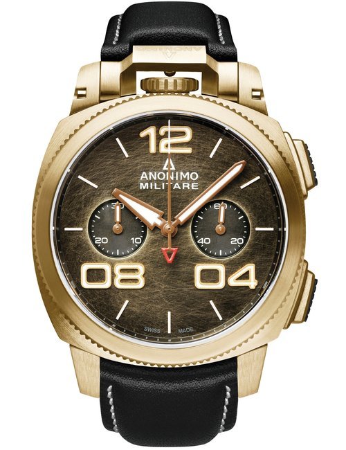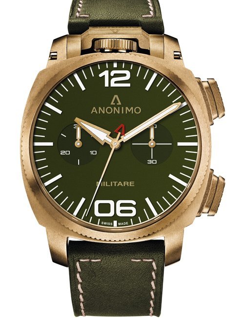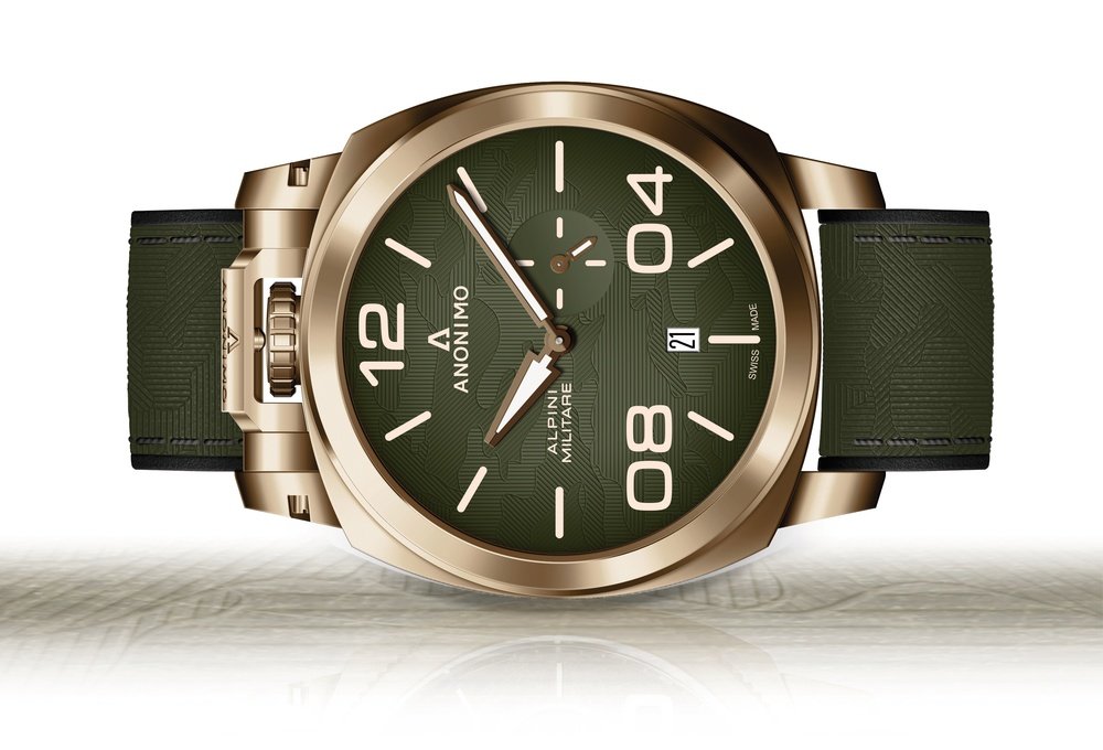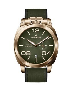 One foot in Italy, the other in Switzerland: like the Matterhorn engraved on the back of its case, the Militare Alpini Camouflage combines the strength of Italian design with the excellence of Swiss mechanical watchmaking. Inspired by the uniform worn by Italy’s elite mountain corps, the Alpini, the Militare Alpini Camouflage boasts a deliberately uncluttered dial whose tone-on-tone camouflage pattern in no way diminishes the extreme legibility of the indications. The distinctive features that helped forge the Militare’s success are there, with the robust cushion case in bronze and the crown at 12 o’clock, easily accessed thanks to the patented adjustable lugs. At the same time, Anonimo introduces a new strap attachment at 12 o’clock, a sandwich construction for a slimmer case with an improved curve, and a screw-down back. Masculinity and functionality are guaranteed, in two limited editions of 97 pieces.