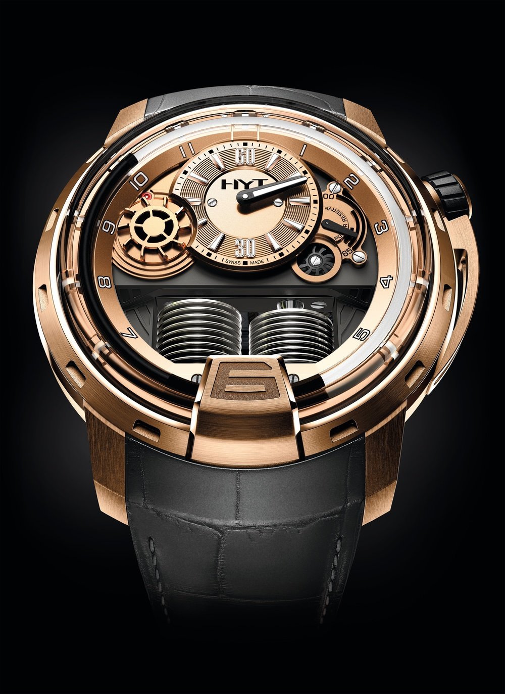 After using high-tech, outstanding and classic designs and materials, HYT is now exploring noble metals, by presenting its first ever case made in 18K pink gold. This colour in fact dictates the entire design of this H1, with its dial displaying pleasing contrasts between the warmth of gold and distinctive black indications. For the first time, the fluid hours indicator of the H1 Full Gold is also black. The central concept of the HYT brand consists in replacing the hours hand by a coloured fluid that moves up and down in a capillary: a less than one-millimetre glass tube. The deep black liquid advances steadily until 6 pm and then switches to retrograde mode and flows back to its initial position (6 am). Like the four other colours developed by HYT, the black shade has its own specific properties. 50-piece limited edition.