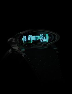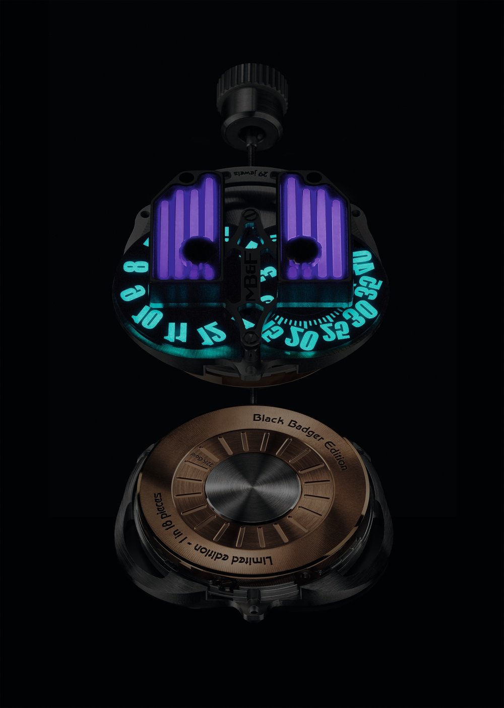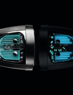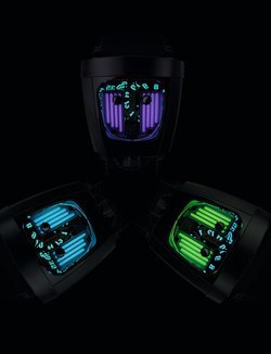A cross between watchmaking traditions and an innovative concept, the, the HMX from MB&F takes on a new guise, created in partnership with designer James Thompson (Black Badger), who specialises in luminescent composites. This limited series of 3 x 18 pieces reprises the HMX’s unique display. Jumping hours and trailing minutes are carried by discs that are positioned flat on top of the movement. They are angled at 90° and enlarged by a double prism and a magnifier. Indications are read from a vertical window, cut in the steel and titanium case. MB&F has souped up the popular casket-shaped driver’s watch of the 1970s into a supercar version. The entire movement, designed like an engine, can be seen through the wide sapphire crystal pane in the watch’s “hood”. For this version, the engine’s rocket covers are cut from blocks of lume, Black Badger’s signature material, to illuminate this HMX Black Badger in green, blue or purple.