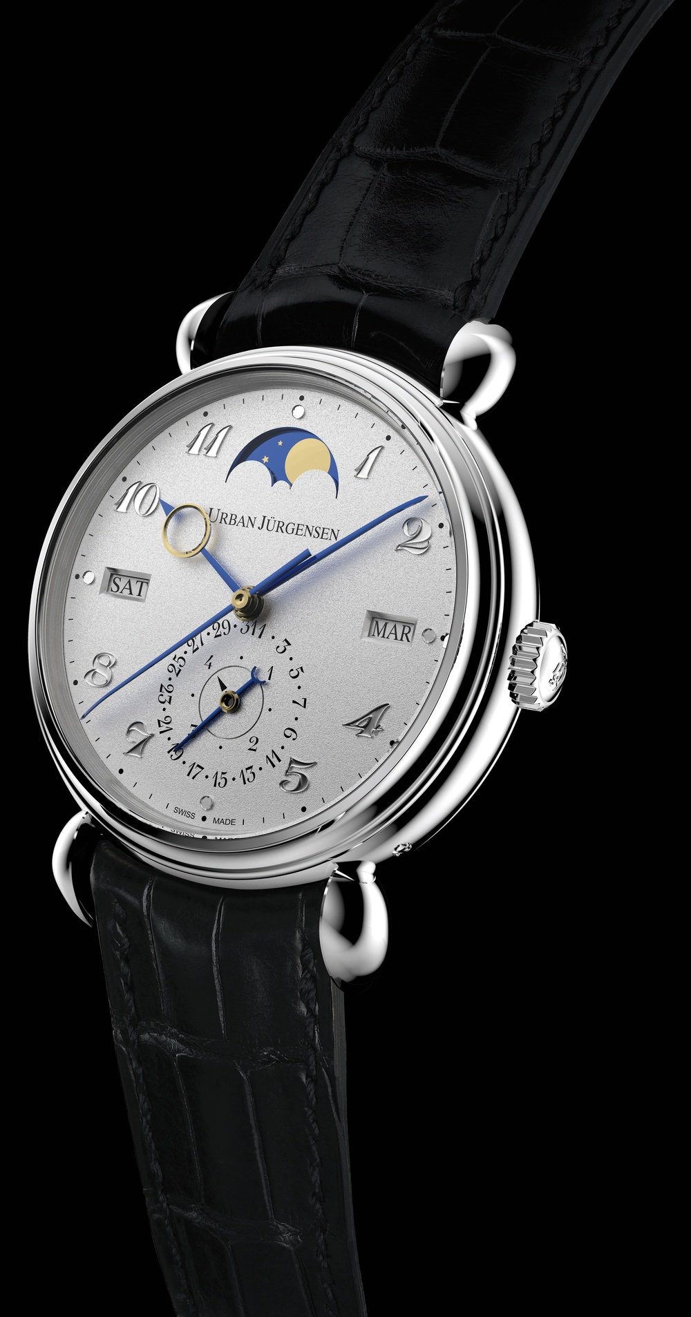 Urban Jürgensen is introducing a new model, Reference 1741 Platinum with perpetual calendar, leap year indicator and moon phases. This timepieces showcases an almost forgotten traditional technique called grenage admirably revived by the brand. It is hand-crafted, delicate and time-consuming, but the final result justifies the difficulties in creating such intricate dial finishing. The hand-made grenage dial is fitted with the white gold applied Arabic numerals. The moon disc involves more than 20 different operations required to create a unique miniature marvel of classic workmanship such as is rarely found in timepieces nowadays. The reference 1741 caliber is based on the P4 in-house movement. The elegant case profile featuring convex and concave curves consists of 3 main parts: the middle fitted with individually soldered teardrop lugs; the top bezel featuring a domed sapphire crystal, and the screw-in back equipped with flat sapphire crystal.