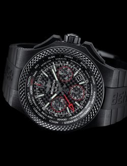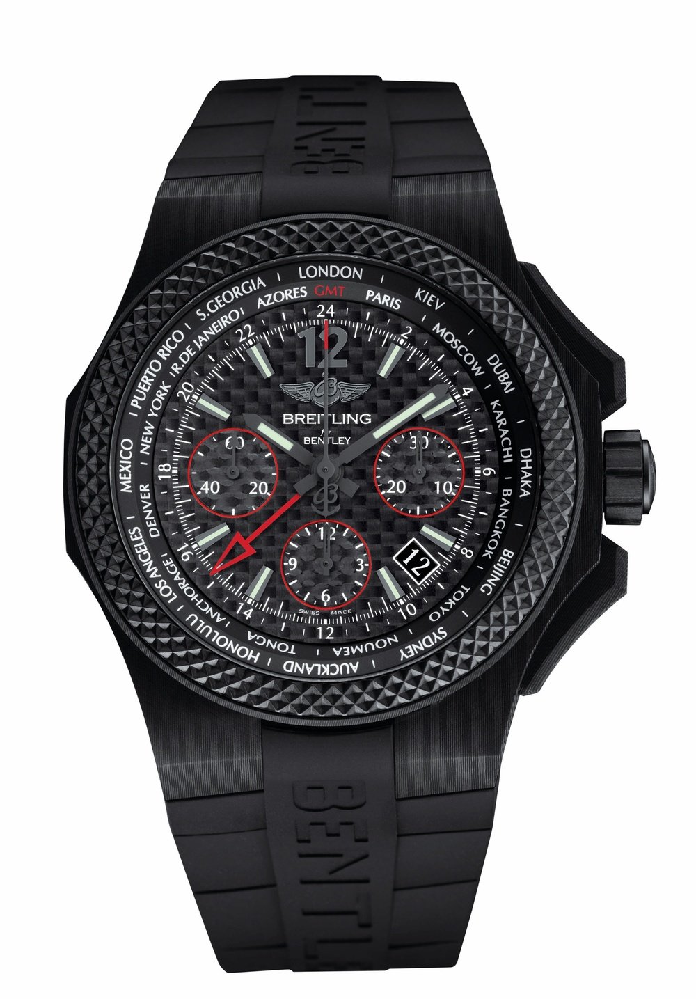 In tribute to Bentley’s impressive competition track record, Breitling is issuing an all-carbon version of its GMT B04S chronograph, based on this ultra-modern material used on the chassis of Formula 1 racing cars as well as in aviation and racing boats. The case of the Bentley GMT B04S Cabon Body is composed of tiny carbon fibres woven into several hundred layers placed at a 45-degree angle between each successive layer, and then bonded by heat-set resin. This matt black envelope protects the B04 calibre entirely developed and manufactured by Breitling. This chronograph also provides a second timezone function, coordinated with a list of reference cities appearing on the rotating pinion bezel. The carbon bezel is knurled across its entire surface, marking out this 250-piece limited edition as a member of the Breitling for Bentley family.