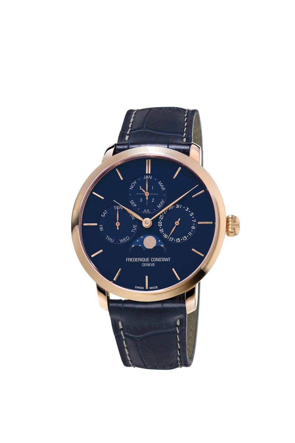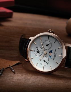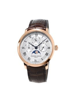 An authentic challenge masterfully taken up: Frederique Constant presents its first Manufacture perpetual calendar movement. Considered one of the peak achievements of the watchmaking art, this mechanical marvel was developed using cutting-edge technologies. The Manufacture Perpetual Calendar combining tradition and innovation is designed to match the modern world: it is sturdy, reliable and easily adjustable, while embodying the excellence of Swiss fine craftsmanship. This highly sophisticated model takes account of alternating 30- and 31-day months, of the 28 days in February, as well as the leap-year cycle and the moon phases. All these indications can be easily adjusted by means of inset pushbuttons on the sides of the case. This movement joins the now 19-strong family of Frederique Constant in-house calibres.