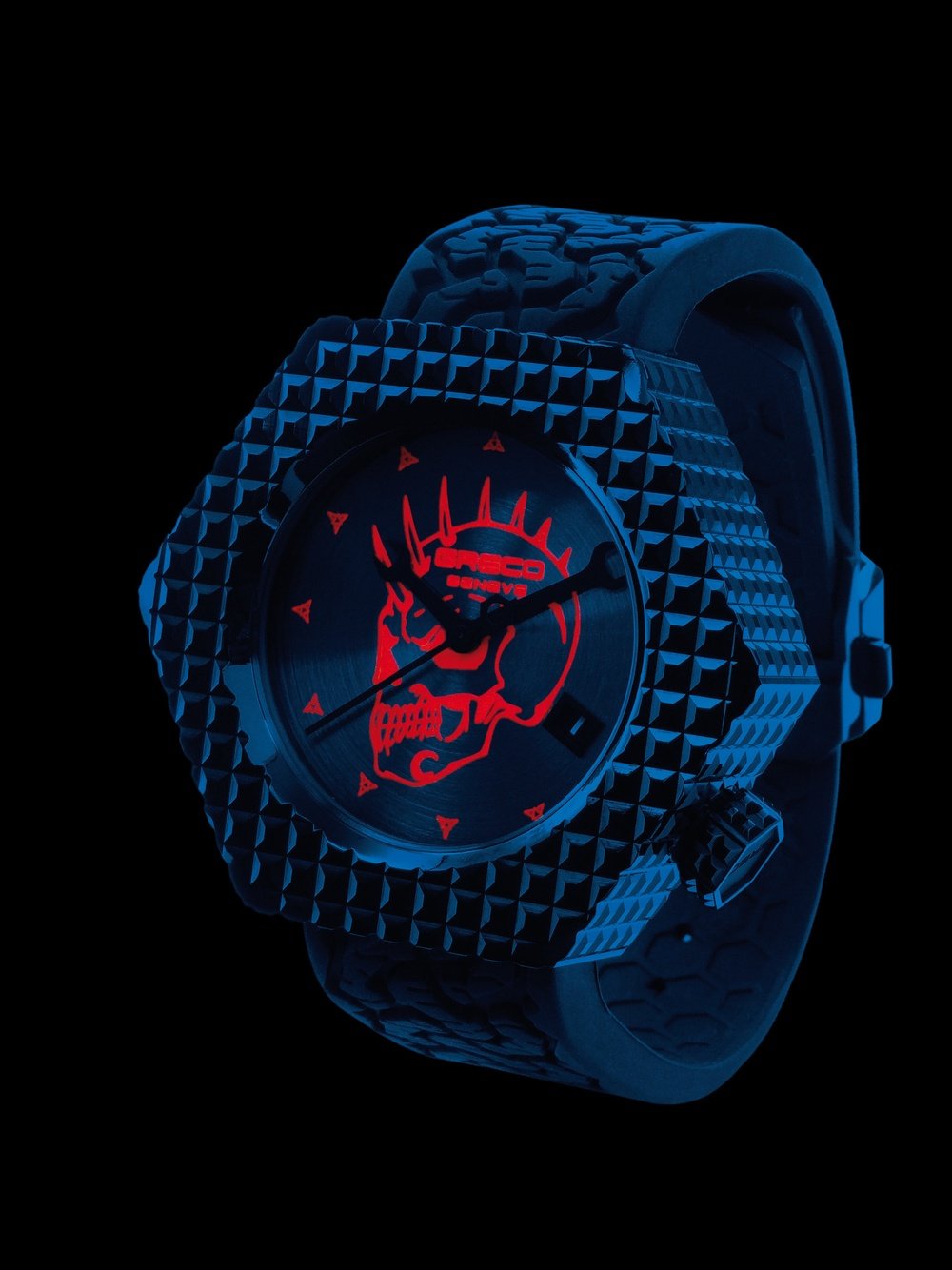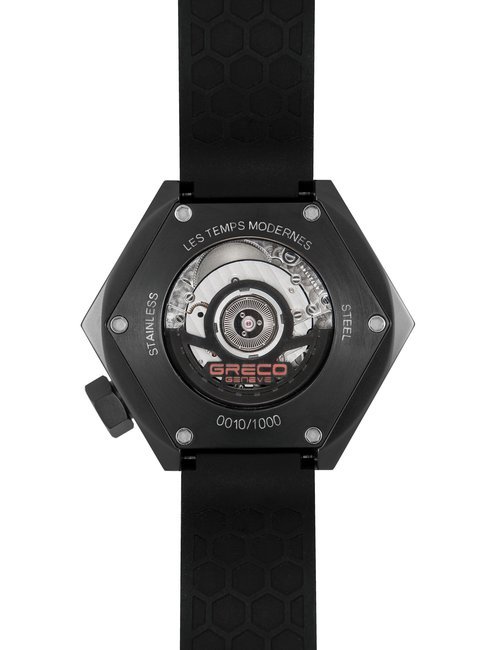 Rebellious, offbeat and even downright crazy, the singular hexagonal nut-design watch by Greco Genève steps things up another notch by adopting a fluorescent look. An original new iconic model in Les Temps Modernes collection whose stylistic inspiration stems from the masterful Modern Times film by the well-known artist, the LTM22t stands out in several ways. First and foremost, its black DLC-treated titanium case shaped like a hexagonal nut naturally catches the eye. Secondly, the skull motif asserts itself as a deliberately non-conformist signature by day or night. Greco Genève enhances the originality of the hexagonal nut shape by fluorescent pigmentation based on a chemical compound used in making banknotes and detectable under UV light. Since the use of the latter is subject to strict quotas, the LTM22t is issued in a 33-piece limited edition. A contemporary and eccentric watch embodying an amazing blend of mechanical horology and highly innovative chemical processes.