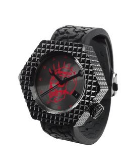 Anthracite, circular satin-brushed, fluorescent red-lacquered skull.