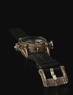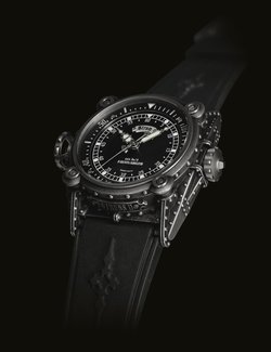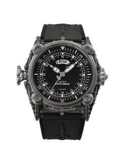 Hand-finished, individually numbered Nethuns II is an authentic diving instrument meeting international water-resistance and safety norms. Its unique construction is based on a sculpted additional outer case fitted over a perfectly watertight case. A sturdy screw-locked crown at 9 o’clock serves to adjust an inner diving bezel, offering a particularly sophisticated solution that prevents any inadvertent handling.
