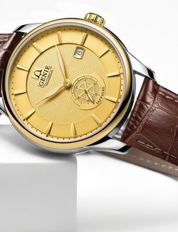 Golden yellow, textured motif. 12 gold-plated hour-markers. Small seconds at 6 o’clock. Date window at 3 o’clock