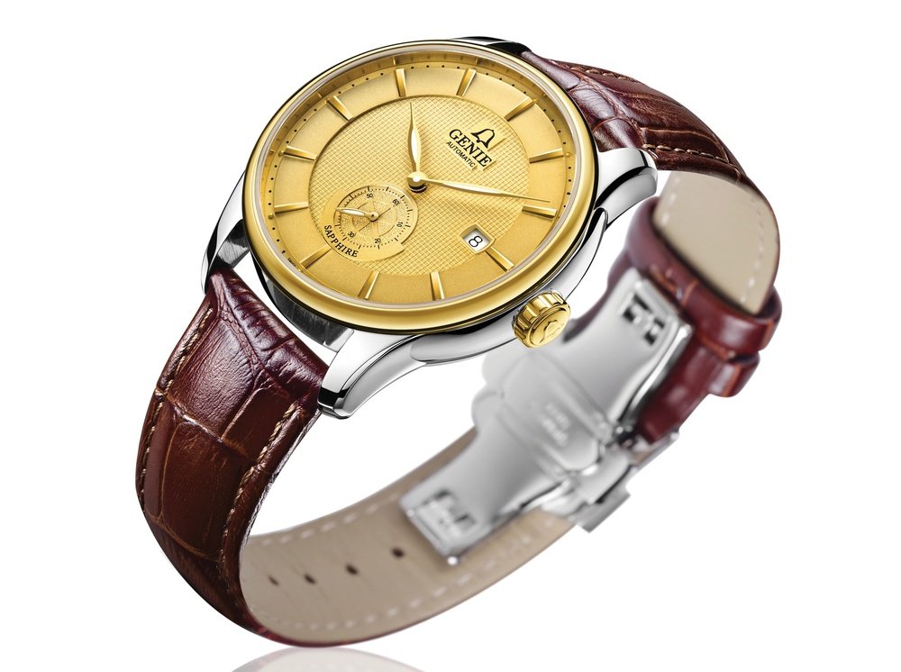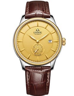In 2017, the Genie brand attires men’s wrists with a new creation combining functionality and sturdiness for pleasant daily wear. The classic design of the steel case is enlivened by subtle two-tone contrasts with a yellow PVD-coated bezel and crown creating a gilded effect. The delicately structured dial picks up this refined colour scheme, while displaying perfect legibility. This remarkably understated watch face is punctuated by applied hour-markers and features small seconds at 6 o’clock and a date window at 3 o’clock, along with the famous Genie “bell” logo appearing at noon. At the heart of this timepiece beats an automatic movement distilling signature Swiss precision, while a brown leather strap secured by a steel folding clasp sets the finishing touch.