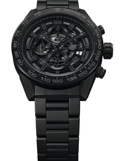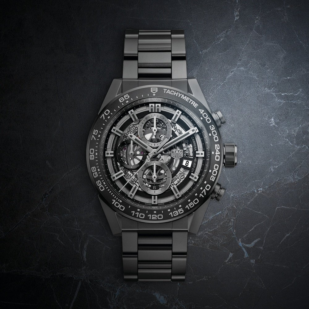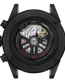 Presented for the first time in 2015, the Carrera HEUER-01 rapidly established itself as THE signature chronograph from the Manufacture TAG Heuer, heralding a new design, a new Heuer 01 in-house calibre, as well as a new modular case design comprising 12 different elements. More sophisticated and contemporary than ever, it returns in an all-ceramic interpretation featuring a beadblasted finishing creating a beautiful deep black shade. Case, bezel, lugs and case middle: all parts exposed to friction are made of ceramic. This ultra-hard material is particularly resistant to scratching, does not oxidise and maintains its radiance over time, while ensuring an extremely soft feel. Further accentuating this wearer comfort, the bracelet with its H-shaped links and matt finish is also made of ceramic.