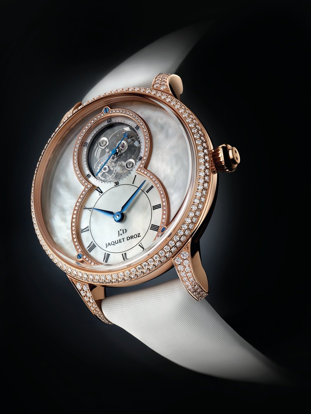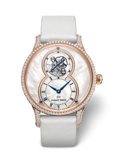 Jaquet Droz returns to its legendary Grande Seconde to create a new standard in women’s watches. To achieve this, its craftsmen have worked with one of the most beautifully luminescent materials: mother-of-pearl. Its shimmering contrasts with the red gold of the case and the inner bezel ring are further enhanced by a river of diamonds. Precious and refined, the Grande Seconde Tourbillon Mother-of-Pearl has secrets of its own, beginning with the white mother-of-pearl adornment on the oscillating weight, and the bridges with a fanned Côtes de Genève motif. One of the masterpieces of horological complications resides at 12 o’clock: the tourbillon. This miniature mechanical sculpture, is the first time Jaquet Droz has given its tourbillon a silicon balance-spring and pallet horns, the guarantee of absolute and lasting precision. 88-piece limited series.