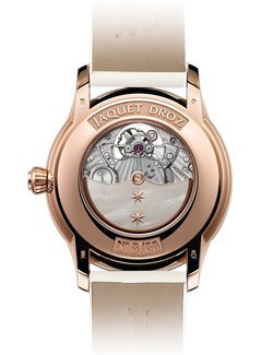 Mechanical automatic, Jaquet Droz 25JD tourbillon calibre, 31 jewels, 21,600 vib/h, silicon balance-spring and pallet horns, 18K red gold oscillating weight with white mother-of-pearl applique, 7-day power reserve.