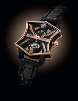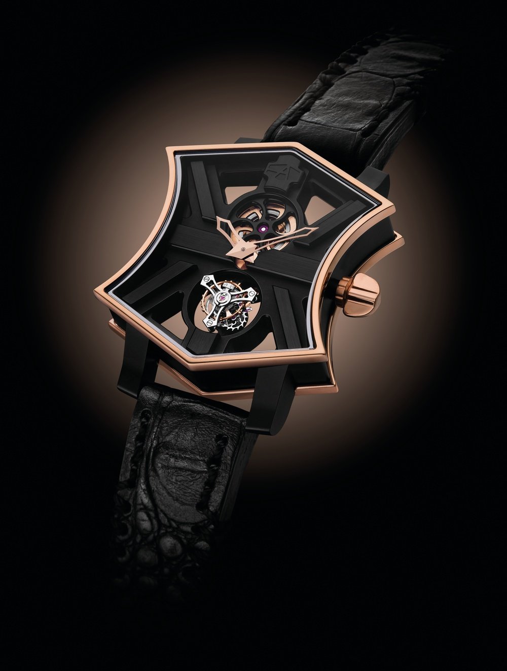 Openworked to form an X shape, hand-engraved with sunray motifs, 60-second tourbillon at 6 o’clock.