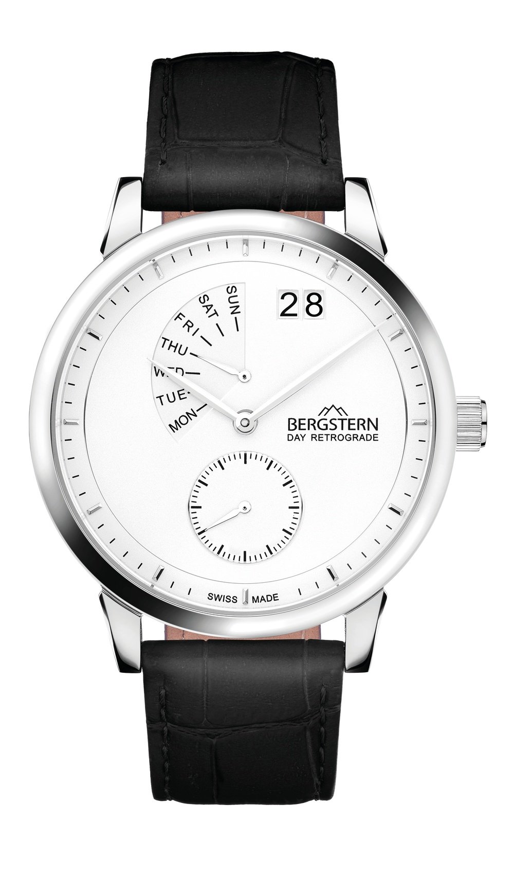 The latest model in the Harmony line is a watch featuring a surprisingly pure layout with offset large date aperture and retrograde day display. The small second at 6 o’clock provides a rigorously geometrical touch perfecting this subtle aesthetic balance. This new elegantly silver-toned creation from Bergstein evokes the majestic purity of the Alpine peaks from which the brand draws inspiration. Beneath its classical experience lies subtly staged and authentic stylistic sophistication. This elegant yet original watch proves that classic lines continue to appeal, particularly when they are interpreted in a refined manner so as to form a coherent whole. This unified approach is harmoniously complemented by a black leather strap.