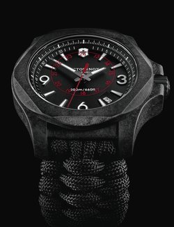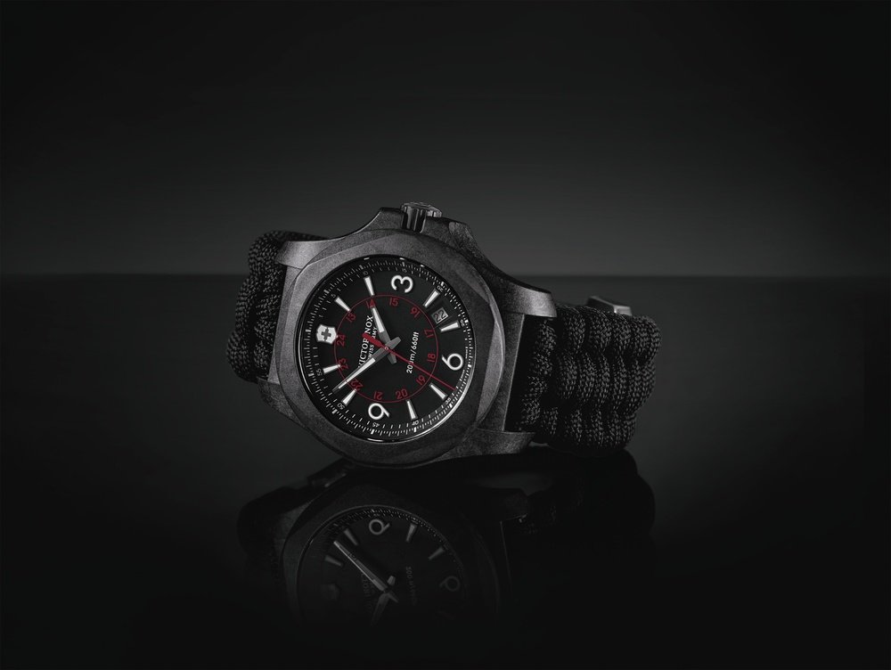 The I.N.O.X. Carbon starts a new chapter in Victorinox Swiss Army’s quest for perfection. Made from a carbon resin composite that protects space shuttles from re-entry temperatures in excess of 1,260°C, it is built to achieve the highest levels of performance. Each I.N.O.X. Carbon watch combines high structural rigidity with scratch-resistance and hypoallergenic properties. Design is a priority too, shown by the clever contrast of red military time, printed under the sapphire crystal, with the subtle marbled effects of the carbon composite. An alternative to the natural rubber strap, a second strap in Naimakka paracord - a multi-strand nylon used for parachute suspension lines that has a breaking strength of 250 kg - equips this I.N.O.X. Carbon for its multiple exploits.