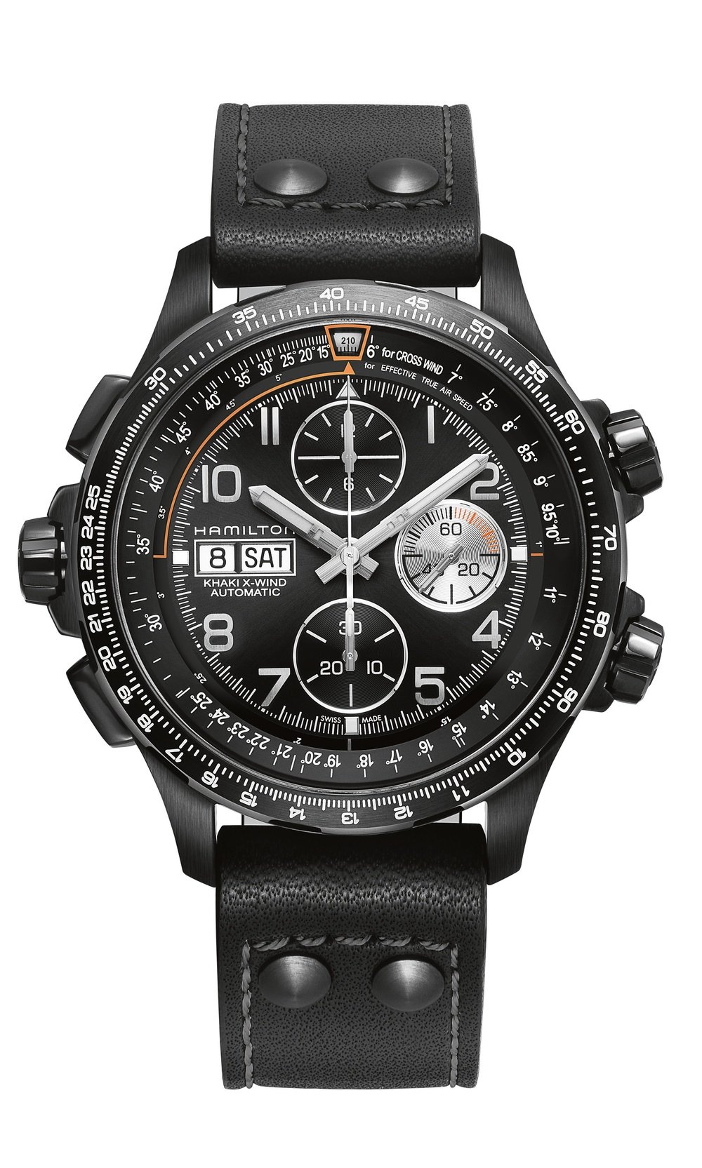 Renowned for its classic aviator styling and functions specific to pilots’ needs, the Khaki Aviation heads for new heights with a new automatic chronograph. A rugged X-shaped case with five pushers, sophisticated monochrome styling, impeccable precision: all the characteristic collection features are there. But what makes this new Khaki X-Wind Auto Chronograph truly unique is hidden inside, since it is one of the world’s first watches to house a drift angle calculator. This instrument enables pilots to accurately calculate and record the crosswinds they will encounter during their flight. Powered by an automatic Valjoux movement modified to increase the power reserve to 60 hours, this new chronograph propels Hamilton’s longstanding heritage in the field of aviation to ever greater heights, as a worthy descendant of the watches supplied to the US Armed Forces from 1914 onwards.