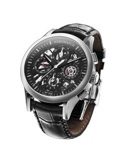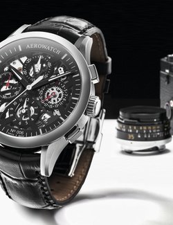 Buoyed by the success of its skeletonised models, the Jura-based Aerowatch brand presents a new creation in a numbered edition. Right from first sight, this Skeleton Semi-Skeletonised Chronograph exudes an appealingly distinctive contemporary style, even though every stage of production is performed in keeping with the finest traditions of Swiss craftsmanship. Like a camera shutter, the cut-out black dial provides tantalising glimpses of transparent halos, revealing the complexity of a mechanical movement. Bridges, oscillating weight, gear trains and blued screws interact with infinite precision, in turn revealing chamfered, rhodium-plated, circular-grained and Côtes de Genève finishing. The enigmatic and intriguing dial features four counters with a resolutely 21st century design, respectively marking off the chronograph hours and minutes, small seconds, as as well as the date.