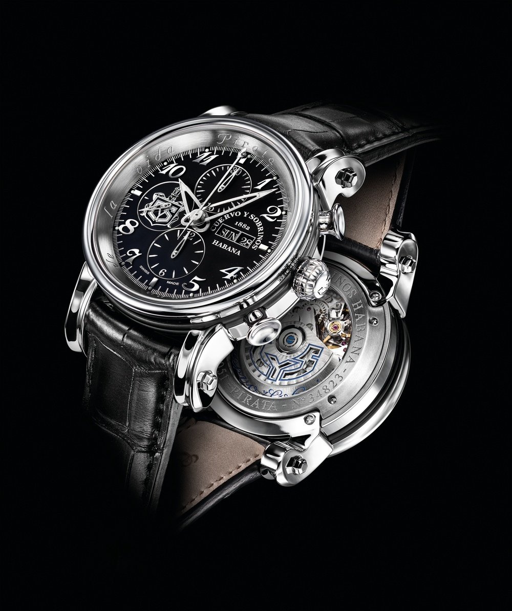 Cuervo y Sobrinos looks to its Cuban origins and brings a Caribbean flavour to Swiss watchmaking. The new Torpedo Pirata Chrono Day Date offers a wealth of details, inspired by the buccaneers who once plundered ships along the Cuban coast. The lugs reproduce the bow of a pirate vessel, a design repeated in the buckle on the strap, while the crown has the shape of a globe. Visible through the sapphire crystal back, the automatic chronograph calibre with day/date calendar sits inside an ingenious case whose modular construction lends itself to all kinds of creativity, such as the use of steel; an innovation compared with previous Torpedo Pirata watches which are sculpted from bronze, a favourite metal of the great buccaneers of the seventeenth century.