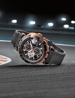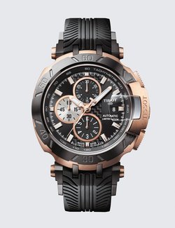 A symbol of the winning partnership between Tissot and MotoGPTM, this 2,017-piece limited edition has a champion’s mindset. Each detail has been carefully chosen to bring the exciting world of motorcycle racing to the wrist. The steel case with black and pink gold toned PVD incorporates pushers in the shape of foot-rests; the attachments recreate the form of a rear suspension bar. The crown-guard partly covers the rotating bezel to suggest the brake disc moving under the caliper. A tyre-tread pattern can be seen on the oscillating weight through the transparent wheel-rim case back. The dial counters take their cue from motorcycle gauges against a carbon-like material. The tyre-tread pattern is repeated on the strap for a sensation of speed and performance. Each watch in this limited edition is presented in a specially designed, helmet-shaped box.