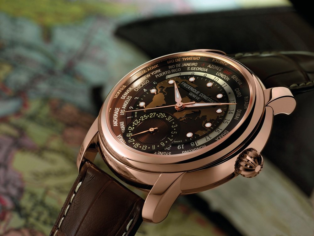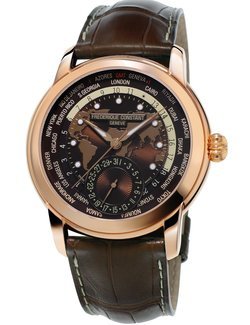 Frederique Constant returns to its iconic Classic Worldtimer Manufacture with the presentation of this sophisticated “citizen of the world”. The golden tones of the case make a pleasing contrast with the chocolate colour of the dial, which is finely etched with a world map and circled by a day/night indicator, with 24 reference cities around the outer rim. The date is pointed by a hand in a subdial at 6 o’clock. A further circle of hour-markers ensures perfect legibility without detracting from the harmonious layout of the dial as a whole. This long-haul traveller packs some genuine feats of technique, orchestrated by Frederique Constant’s FC-718 proprietary movement. Not a single pusher or corrector spoils this watch’s clean lines, as each function is controlled by the crown for unparalleled simplicity of use, a first for a worldtime complication.