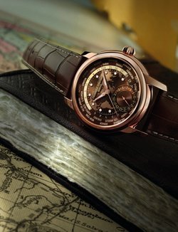 Brown with world map in the centre. Luminescent hands and hour-markers. 24-hour disc with day/night indication. City disc with 24 cities. Date at 6 o'clock.