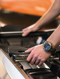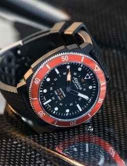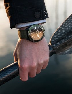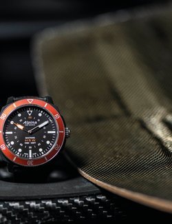 Glass fibre and steel, 44 mm. Black, green, orange or navy blue unidirectional rotating diver’s bezel. Crown serving to adjust all functions. Scratch-resistant sapphire crystal. Water-resistant to 100 metres (10 bar / 330 ft).