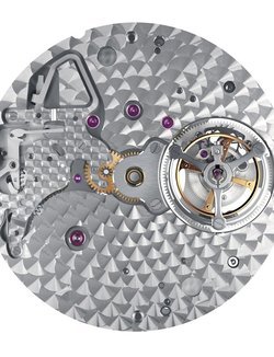 Mechanical hand-wound, 3.4 mm high extra-thin calibre, flying tourbillon with titanium cage, 160 components, 22 jewels, 21,600 vib/h (3 Hz), variable inertia balance with gold inertia blocks, flat balance-spring, rapid rotation barrel, rhodium-plated, circular-grained plate, rhodium-plated bridges with double snailing, ceramic ball bearings, wheels with circular graining on top and underside, 48-hour power reserve.