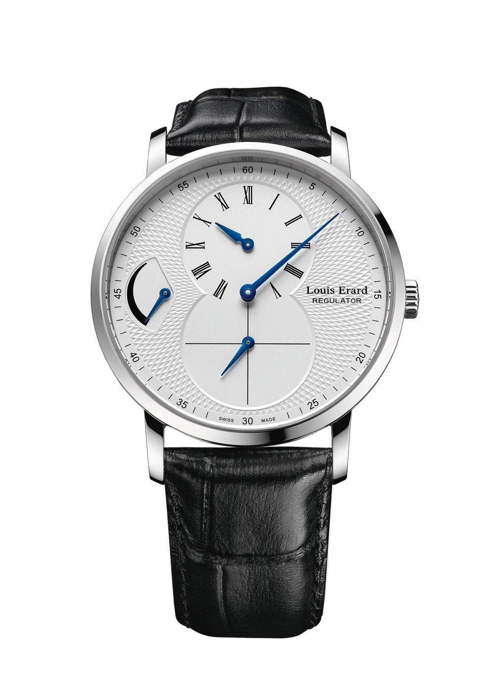 Louis Erard plays the magician by transforming one of the earliest instruments of precision timekeeping into an ‘in-house’ complication driven by an exclusive module: the regulator with power reserve. Combined with a power-reserve display, this sophisticated mechanism elegantly expresses purity and refinement through a timepiece mingling a contemporary spirit with a classic aesthetic enabling it to find its way through successive eras while losing nothing of its appeal: Excellence Regulator with Power Reserve. Enthroned at the centre of the silver-toned guilloché dial, the regulator draws all eyes, while the hours and seconds tick by on two separate counters at 12 and 6 o’clock respectively. Perfecting the visual balance of the dial design, the retrograde power-reserve indicator appears at 9 o’clock, while a black leather strap sets the ideal finishing touch.