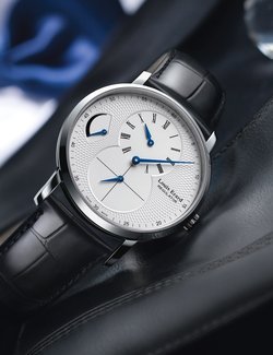 Silver guilloché stamping. Regulator with offset hours subdial at 12 o’clock, central minutes hand, small seconds at 6 o’clock and power-reserve display at 9 o’clock.