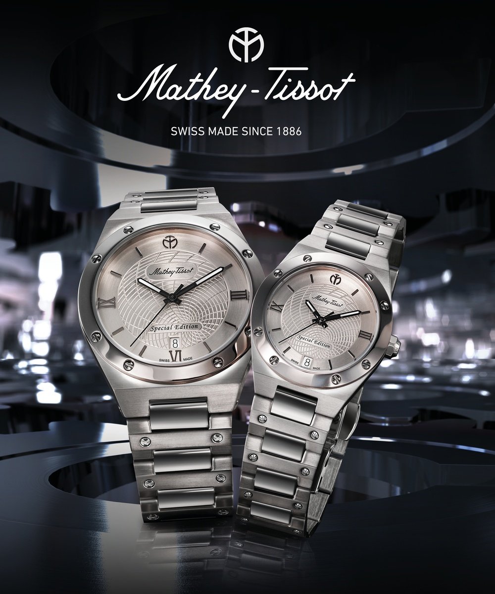 Known since 1886 for the fine craftsmanship of its watches, Mathey-Tissot now presents a creation combining timeless classicism with casual-chic sophistication, infused with a subtly contemporary touch: Elisir Special Edition. Presented in two 29 mm and 40 mm sizes for women and men respectively, the case exudes a sense of dynamism, accentuated by the visible screws also picked up on the bracelet. The case and bracelet feature elegant contrasts between the polished and satin-brushed finishing. A curving pattern on the dial evokes a globe motif, ringed by beautifully understated Roman numerals and hour-markers. Free of any superficial elements, this new Elisir Special Edition stages a particularly legible display of the time and date, natural becoming the indispensable companion of today’s man and woman.