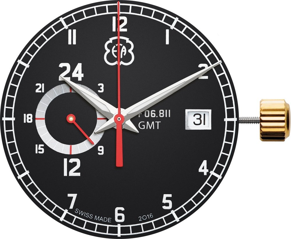 ETA SA Manufacture Horlogère Suisse, a Swatch Group company, is enriching its line of ‘Swiss Made’ range-entry movements by launching the F06.811 calibre measuring 11 ½ lignes, meaning a 26.20 mm diameter. With the arrival of this movement powering a 24-hour GMT indication, the Trendline collection welcomes a new type of display enabling simultaneous reading of the time in two different parts of the world. While local time is still indicated in the dial centre, home time appears at 9 o’clock in a 24-hour counter. This GMT function is based on an innovative mechanism serving to indicate two separate displays: one in the centre and the other at 9 o’clock, both powered by a single ‘engine’.