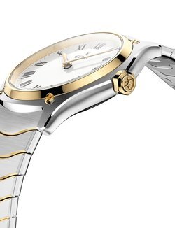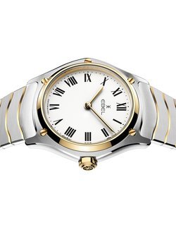 Ebel revisits a sport chic icon from the 1970s and 1980s, whose pure, timeless style is entirely in tune with current trends. This new 21st century Ebel Sport Classic elegantly combines the original aesthetic codes with subtly orchestrated new features. The legendary wave bracelet is slimmed down and fitted with an exclusive locking jewellery clasp ensuring a perfect fit on the wrist, while the tapered links reproduce the undulating design of the historical model that was acclaimed as much for its beauty as for its comfort. The steel case also features the original design, with a flat hexagonal shape, topped by a yellow gold bezel held by five functional gold screws. The graphic, understated Roman numerals debut a new font giving the overall design a more contemporary look, while creating an elegant contrast with the white dial.