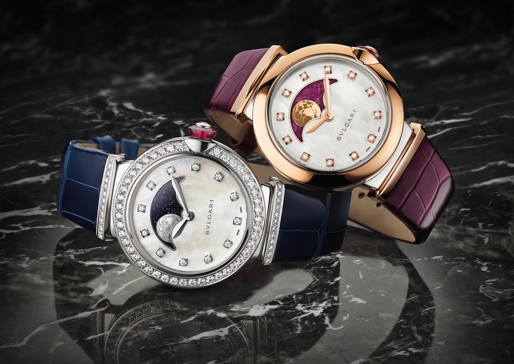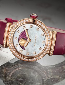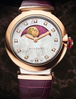 Placing women at the heart of its concerns, Bvlgari plays with contrasts and allies light and moon by revealing the various phases of the mysterious heavenly body on its Lvcea watch. The mother-of-pearl dial reveals a sky alternately unveiling the new moon, the first quarter, the full moon and the last quarter. In a blend of poetry and horological precision, the lunar cycle calculation is orchestrated by the automatic BVL 210 calibre, decorated and finished in the finest Swiss traditions. The new Lvcea moon phases is the ultimate temptation, interpreted in various compositions staging fascinating encounters between the ‘light watch’ and the night star. Intense blue, bright red or plum coloured: the sky around which the moon performs its steady rotations echoes the shade of the strap, while the pink or white gold case is interpreted in versions with or without diamonds, as do the lugs.