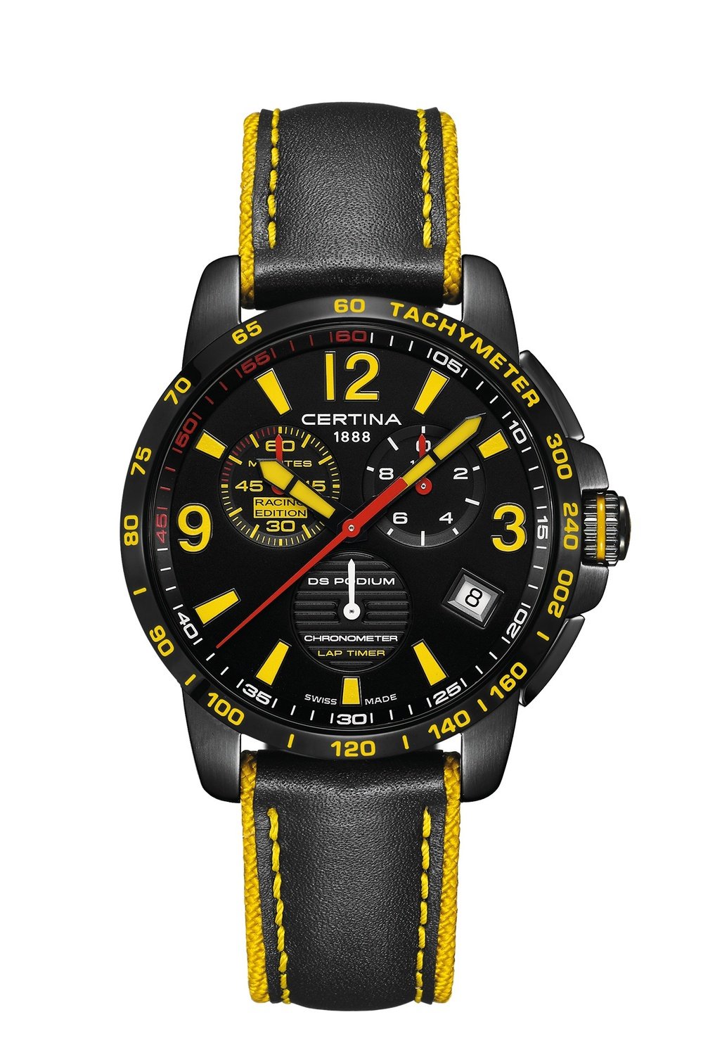 For decades, the Certina name has been tied in with motor sports. The adrenaline-fuelled DS Podium Lap Timer – Racing Edition chronograph sets the seal on the brand’s partnership with ADAC GT Masters, with a livery in the yellow, black and red colours of this racing series. Taking pole position for precision thanks to its quartz Precidrive™ COSC-certified chronometer movement, this is a watch cut out for motor racing, not least thanks to its lap timer which adds individual lap times and displays them at 10 o’clock on the 60-minute counter, this being the length of an ADAC GT Masters race. At 2 o’clock, tenths of a second display in real time for two minutes, which is the average time taken to complete one lap. Blending competition performance with an ultra-sportly design, this new chronograph naturally benefits from Certina’s renowned DS (Double Security) Concept.