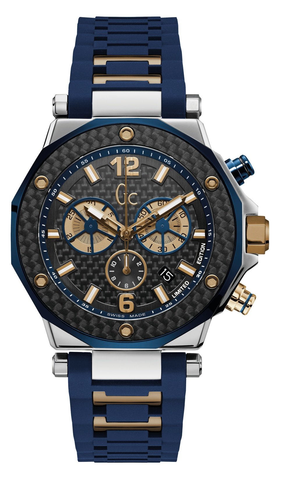 Gc celebrates its 20th anniversary with this limited edition timepiece for men, forcefully embodying “smart luxury”. Reflecting the brand’s watchmaking expertise, the Gc-3 20th Anniversary model is a high-quality Swiss made chronograph with a distinctive design. With its daring colours and material combinations, highlighted by a carbon fibre dial and bezel, teamed with a silicon strap with steel inserts, this timepiece beautifully expresses the dynamic spirit of sporting chic.